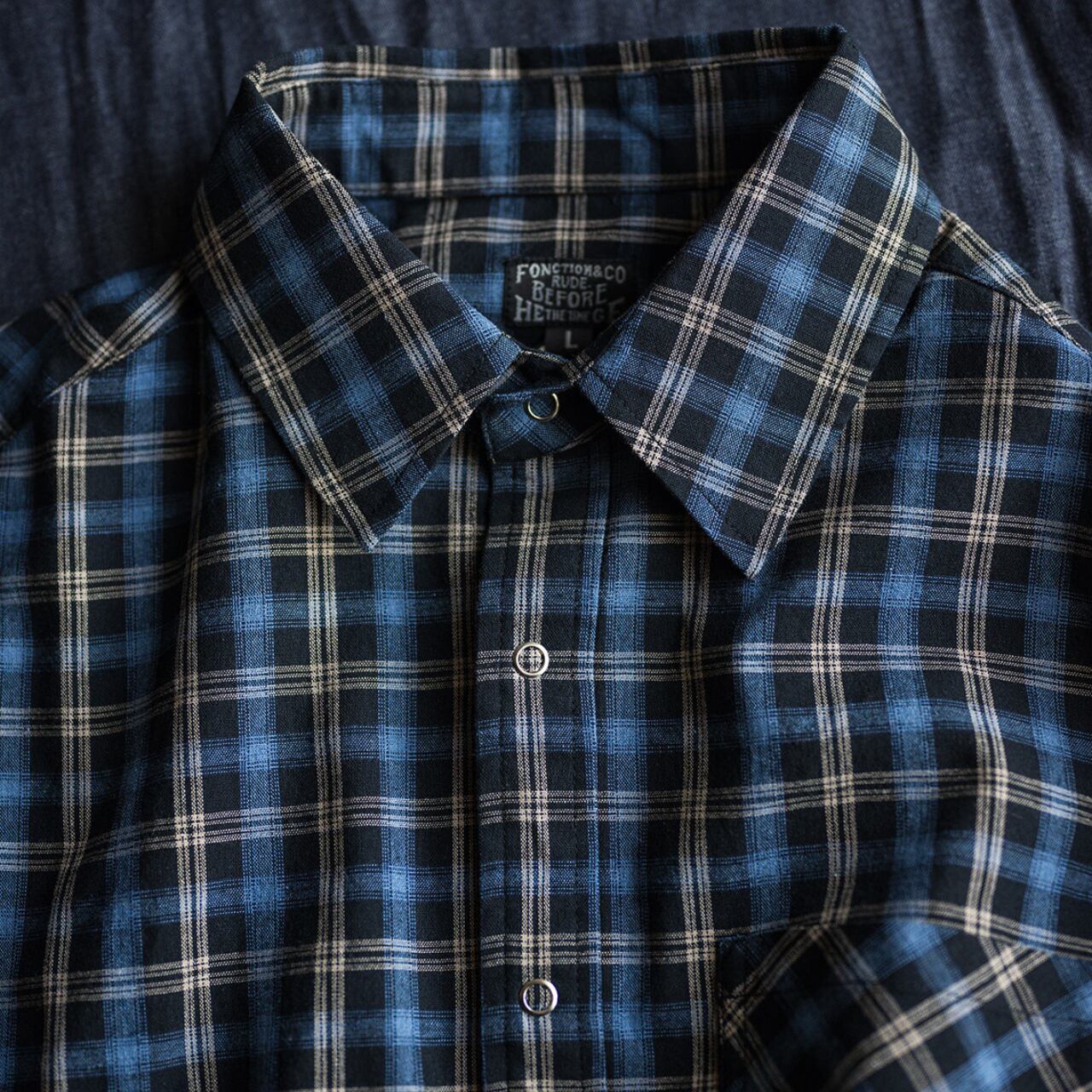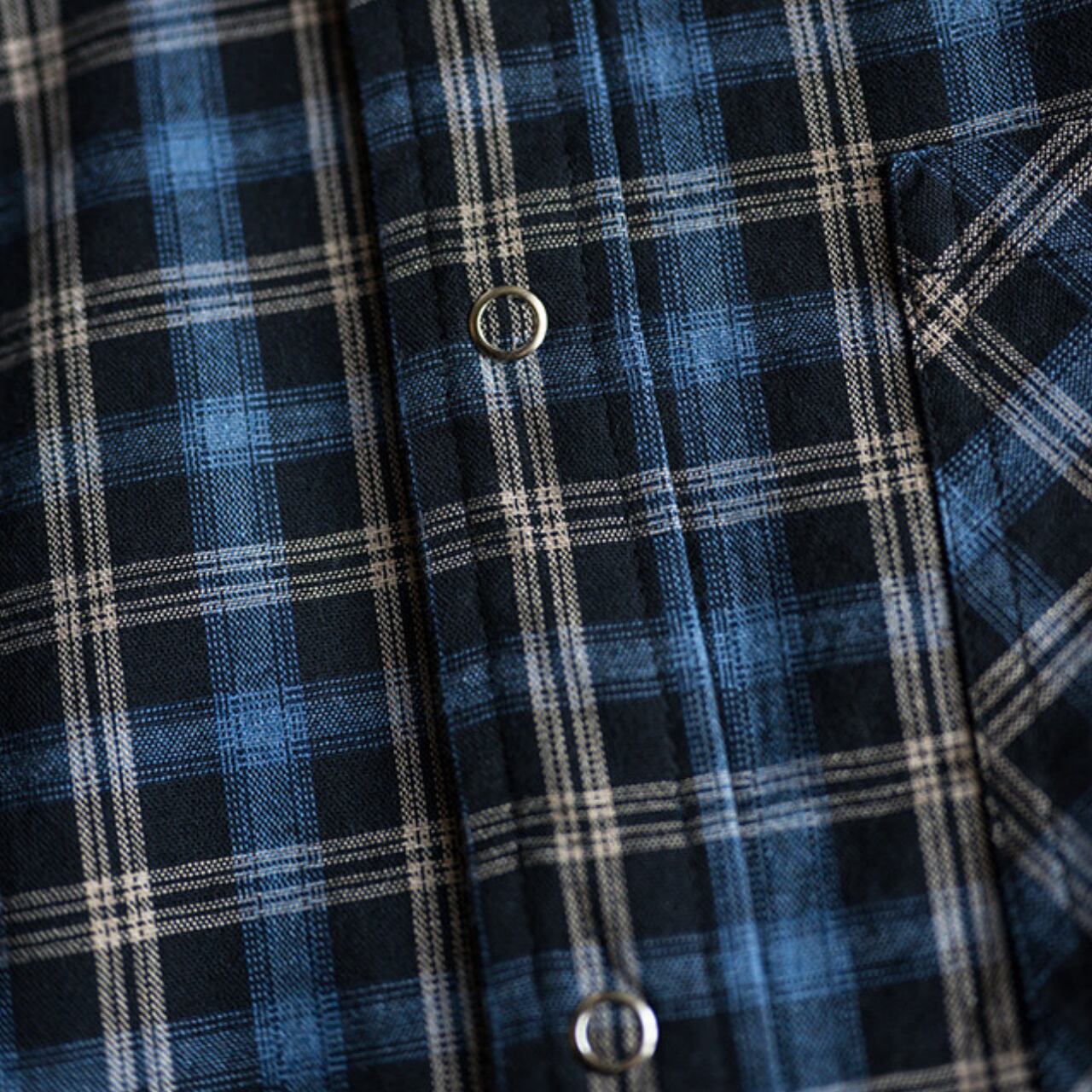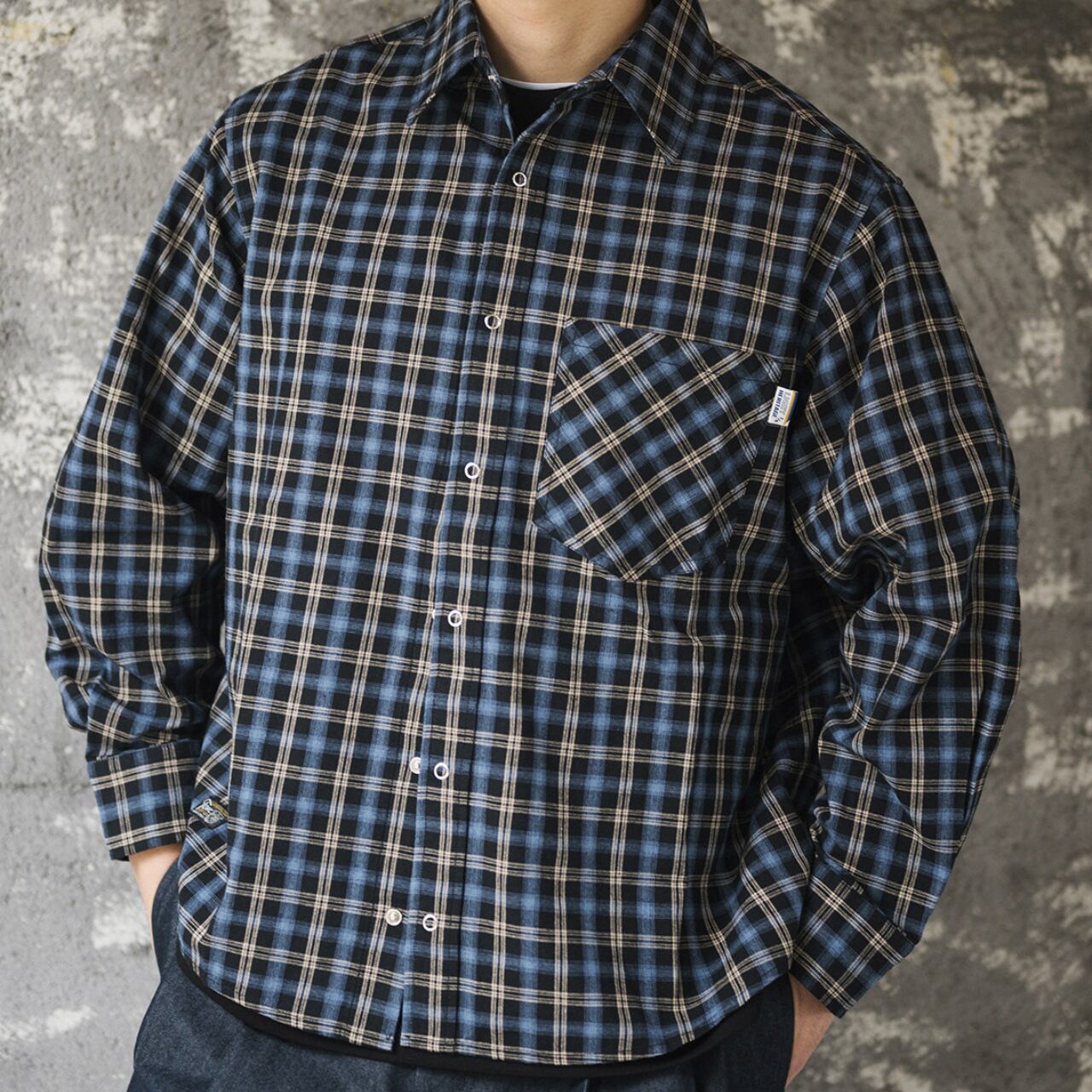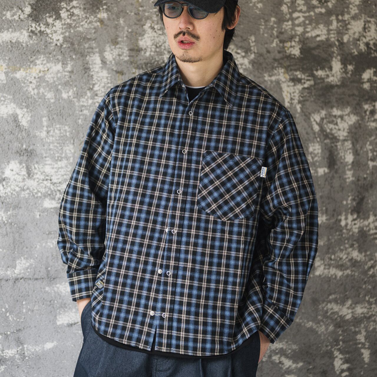 落ち着いたブラックをベースに、ブルーとベージュが自然に溶け込むグラデーションチェックが魅力のヴィンテージチェックシャツ。低彩度のカラーリングが大人っぽく、クラシックで奥行きのある表情を演出します。