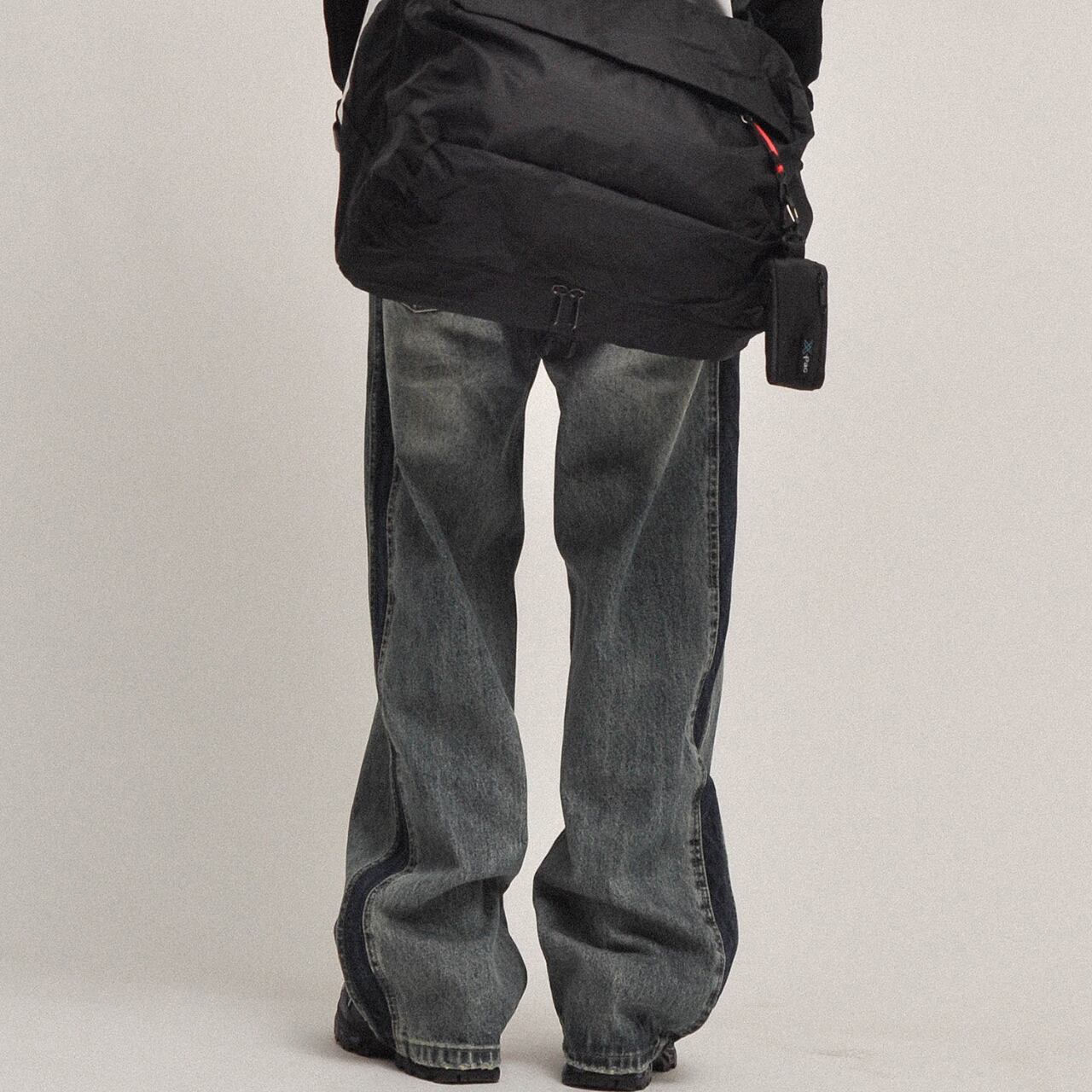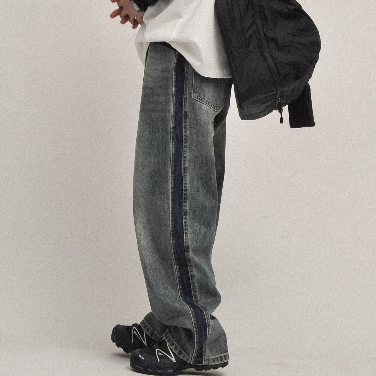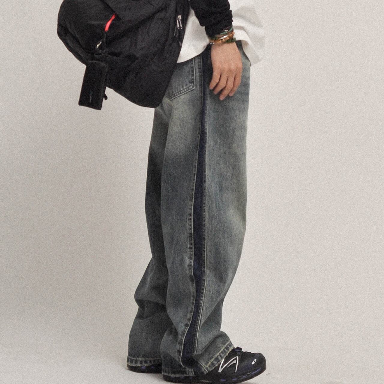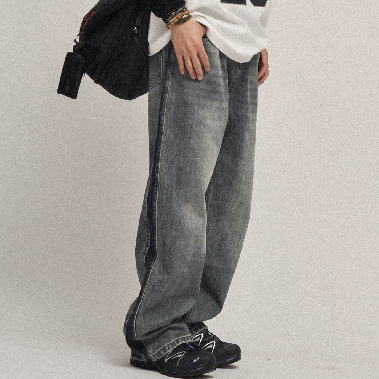程よく色落ちしたヴィンテージウォッシュと、サイドの切り替えデザインが特徴的なワイドデニムパンツ。ストレートに落ちるゆったりとしたシルエットで、ストリート感のあるラフなスタイリングを演出します。