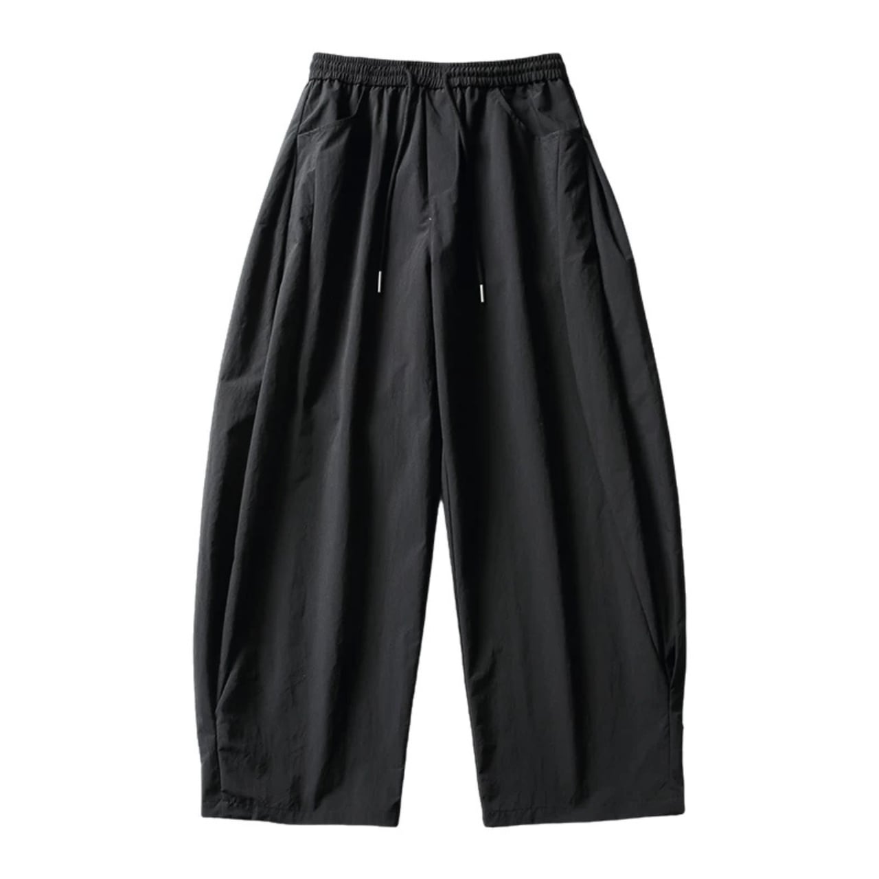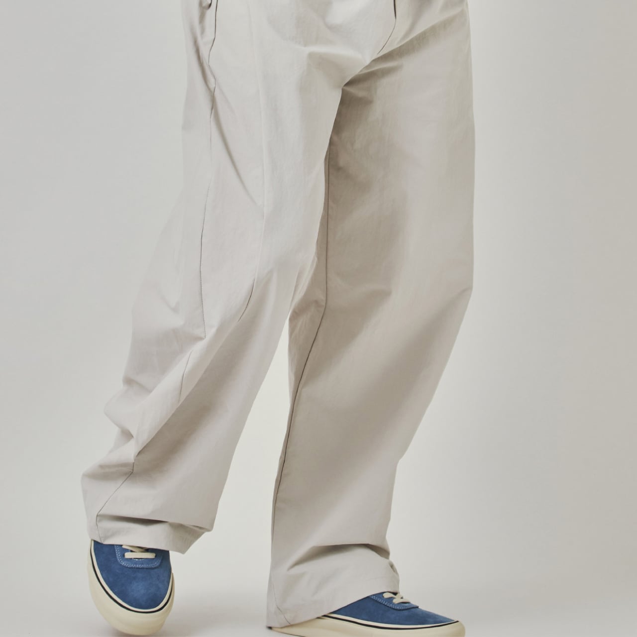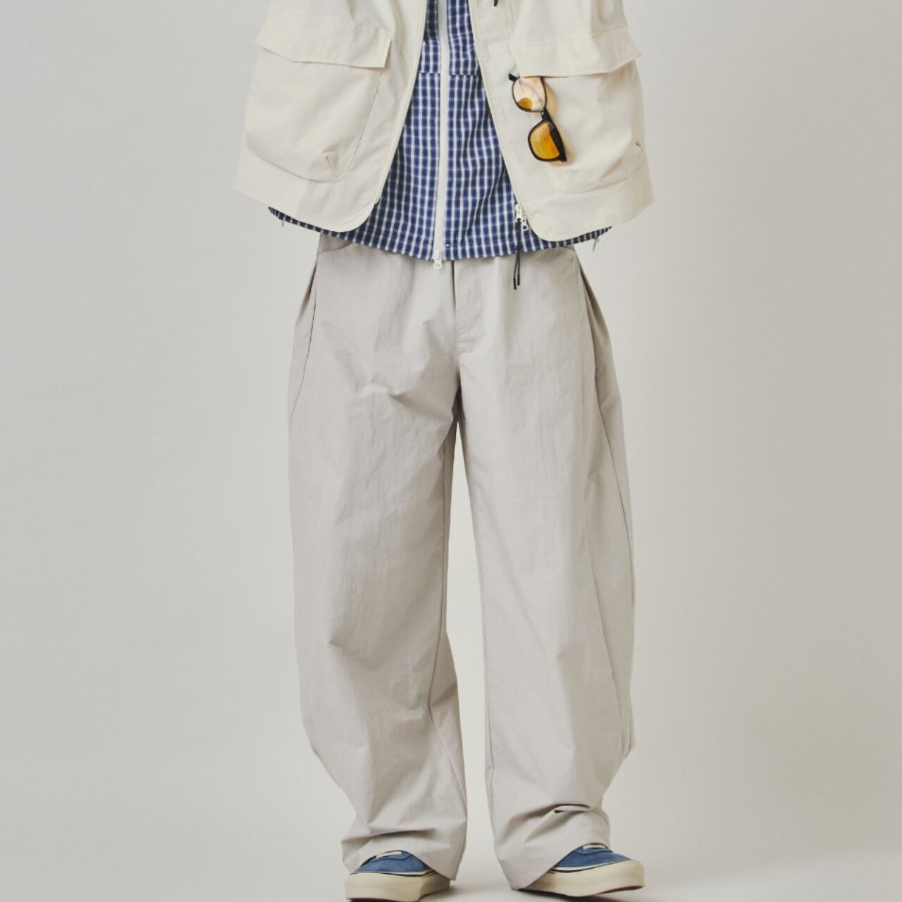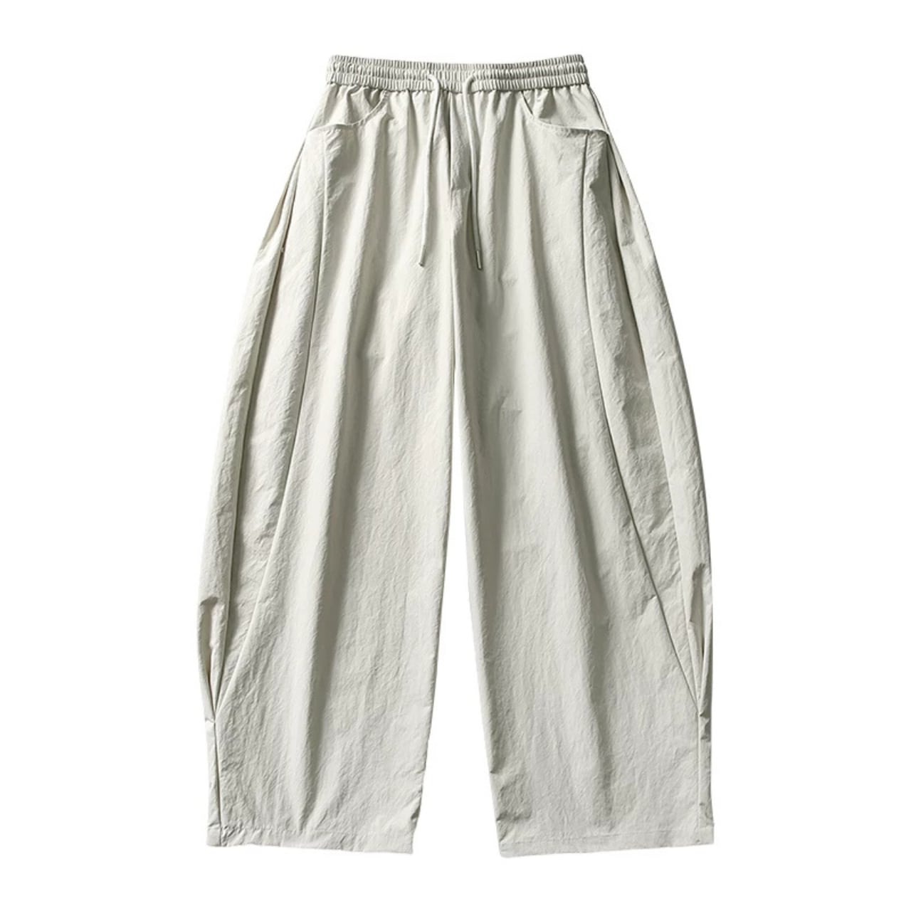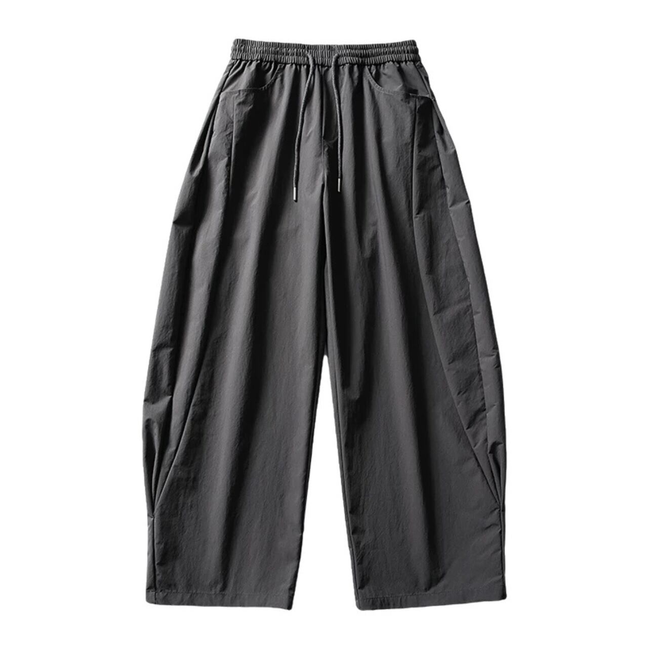 軽やかなポリエステル素材を使用した、ゆったりとしたシルエットが特徴のワイドパンツ。