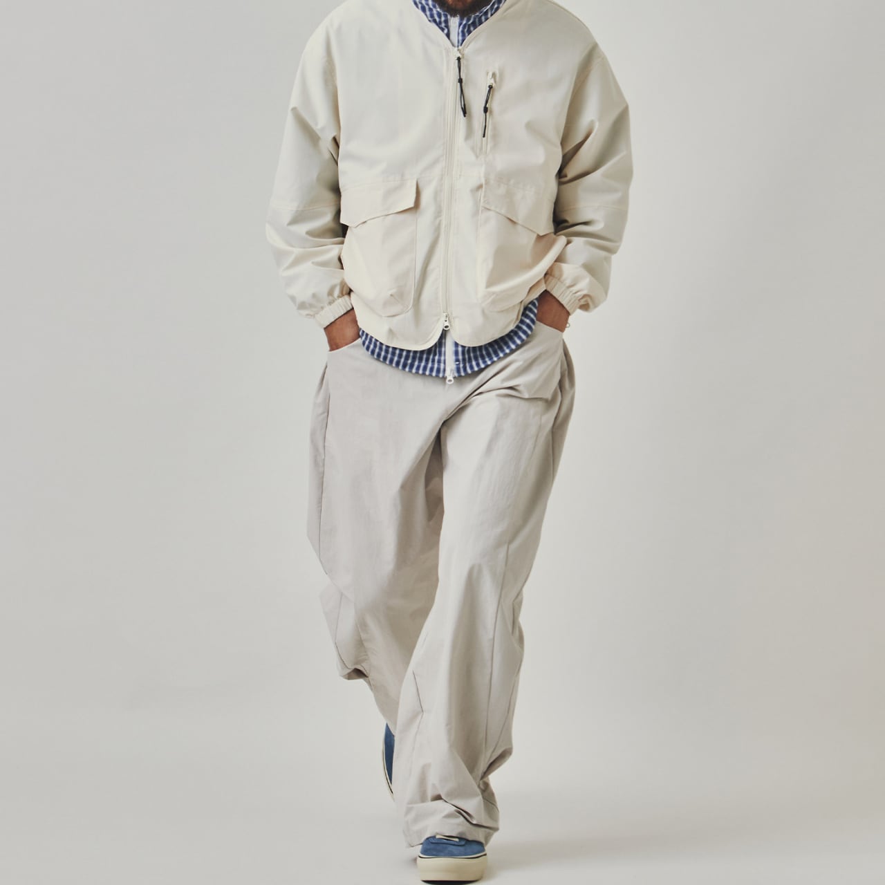 Tシャツやシャツはもちろん、軽いナイロンジャケットやチェック柄トップスと合わせることで、都会的で抜け感のある着こなしが完成します。