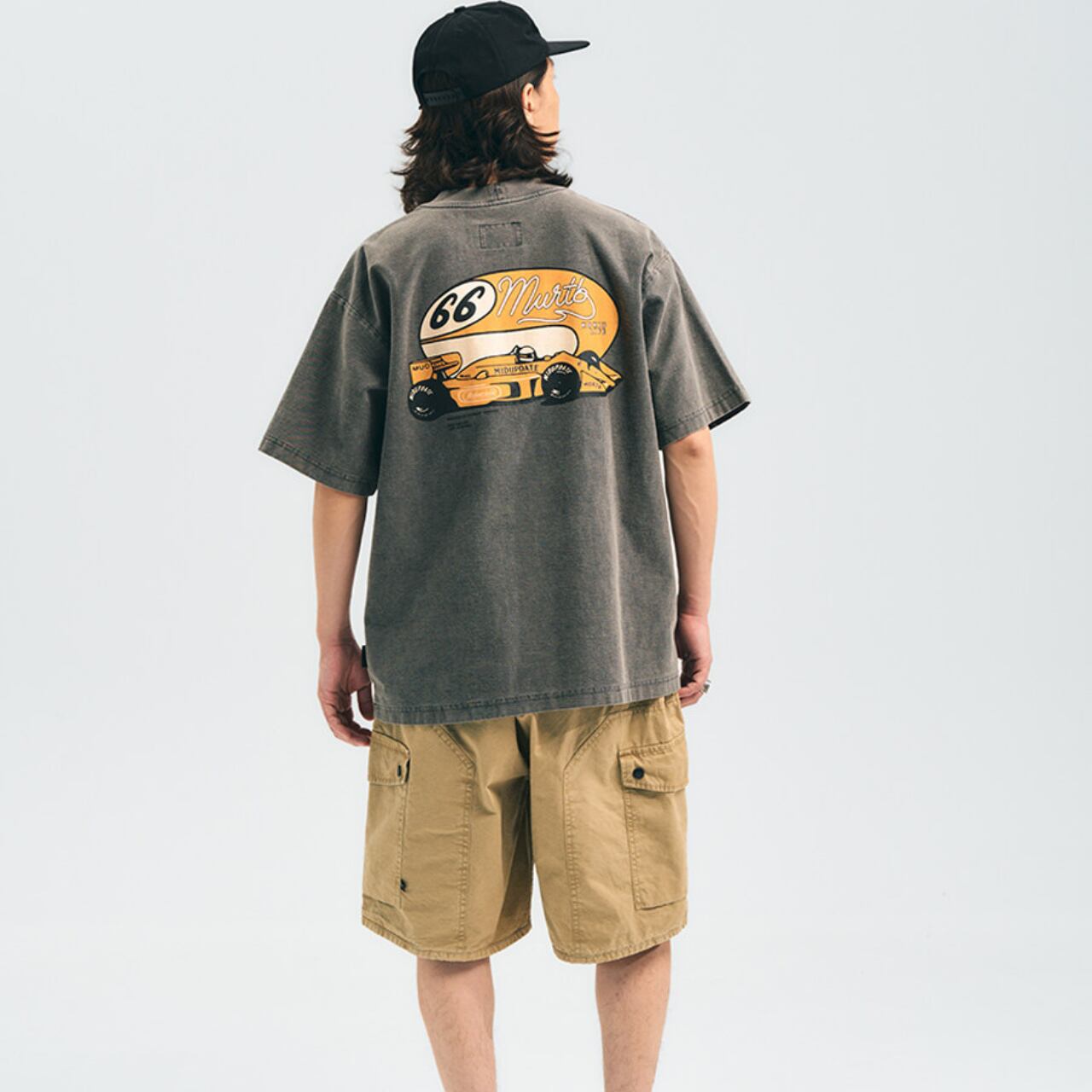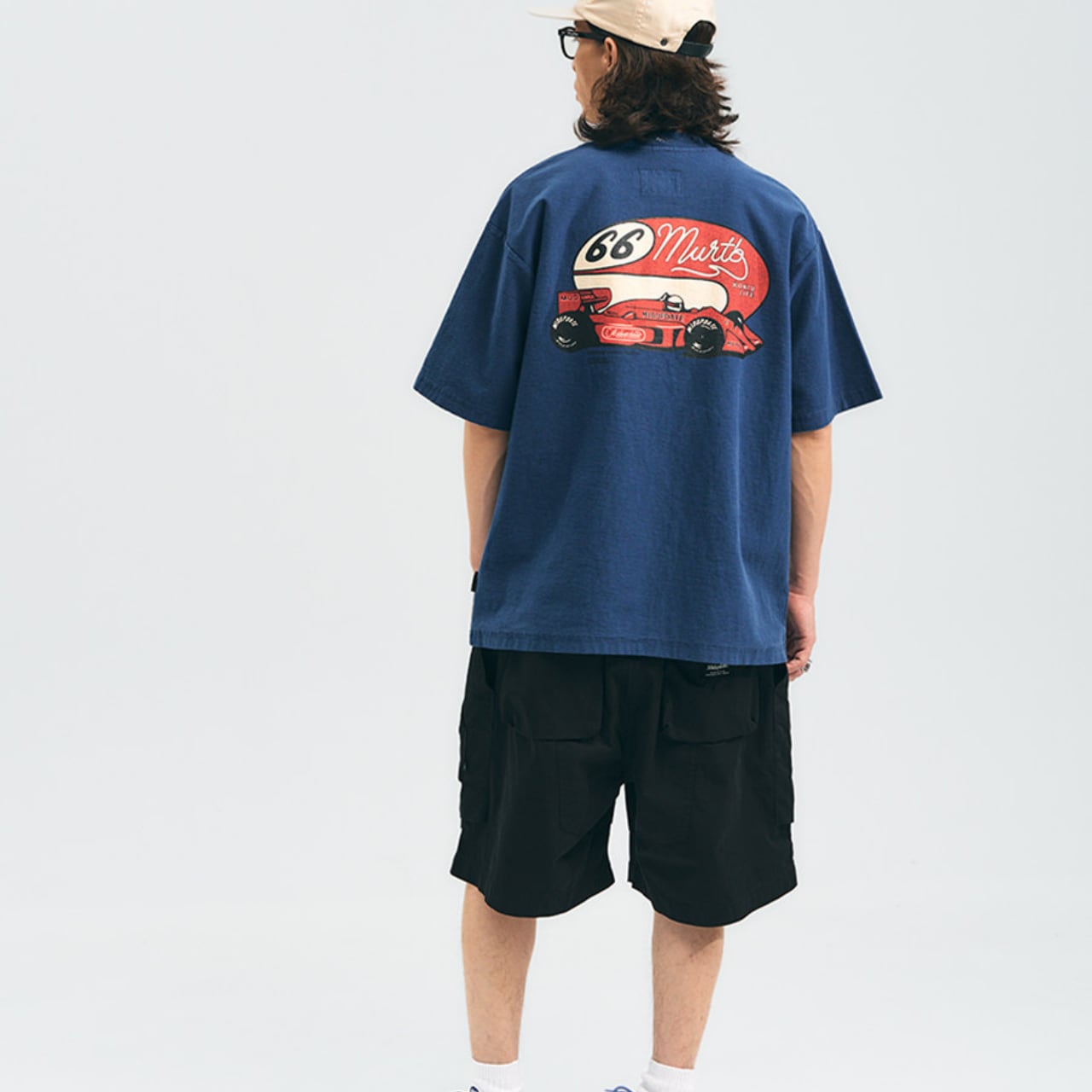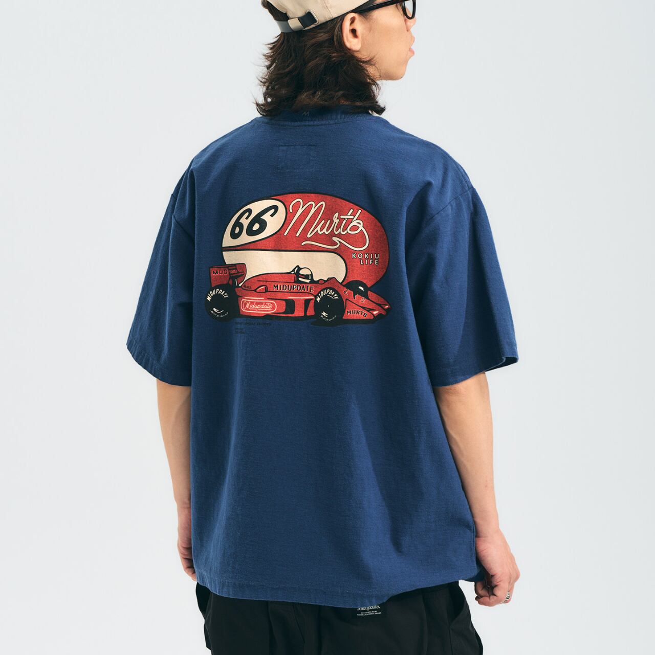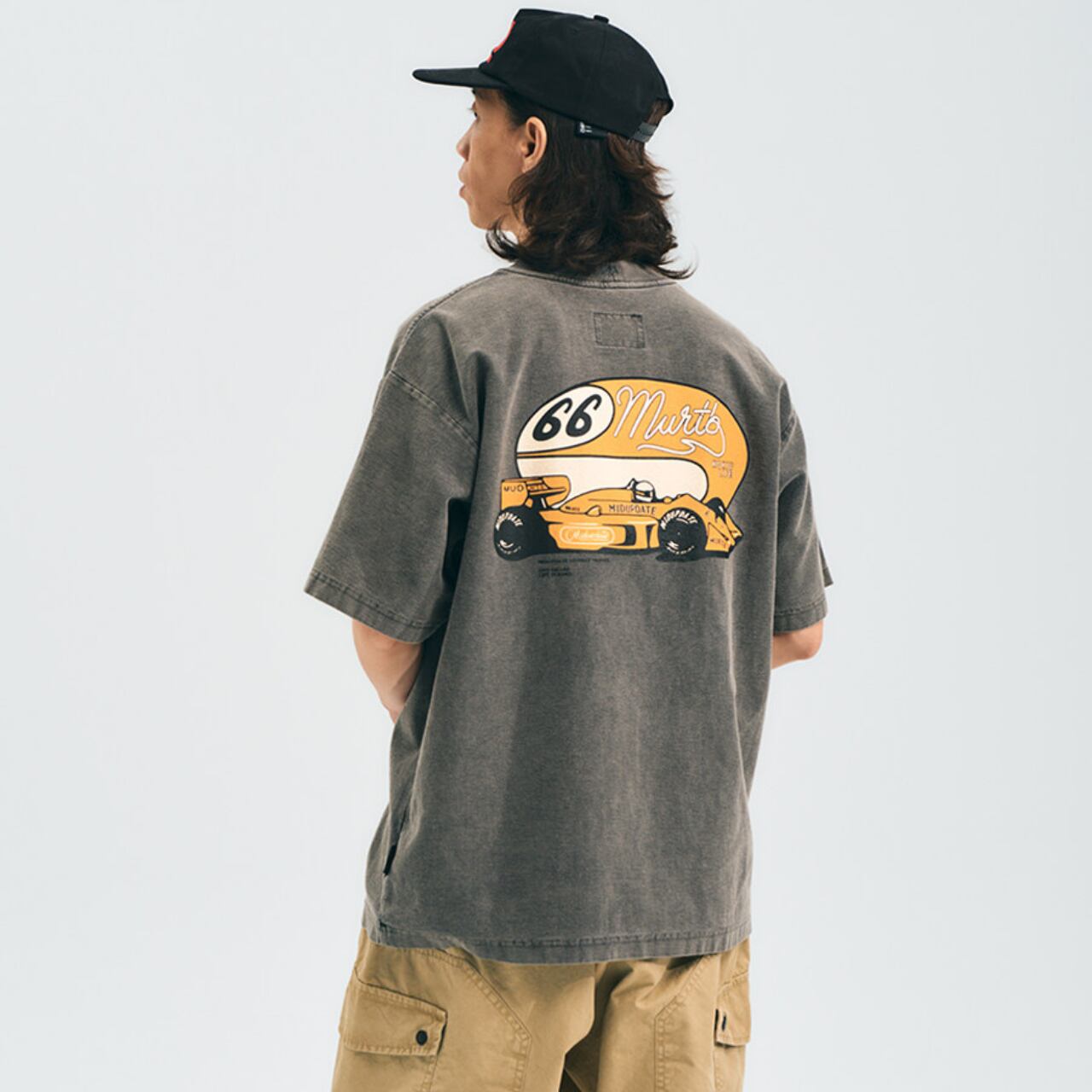 存在感のあるF1カーのバックプリントが目を惹く、ヴィンテージライクな一枚。