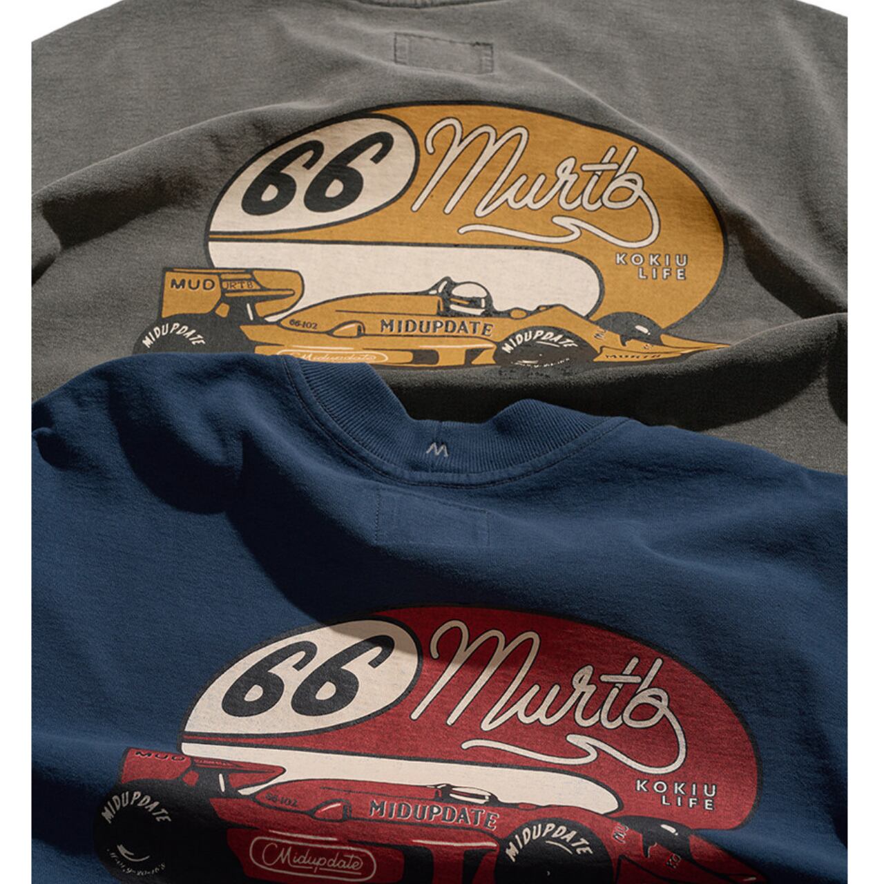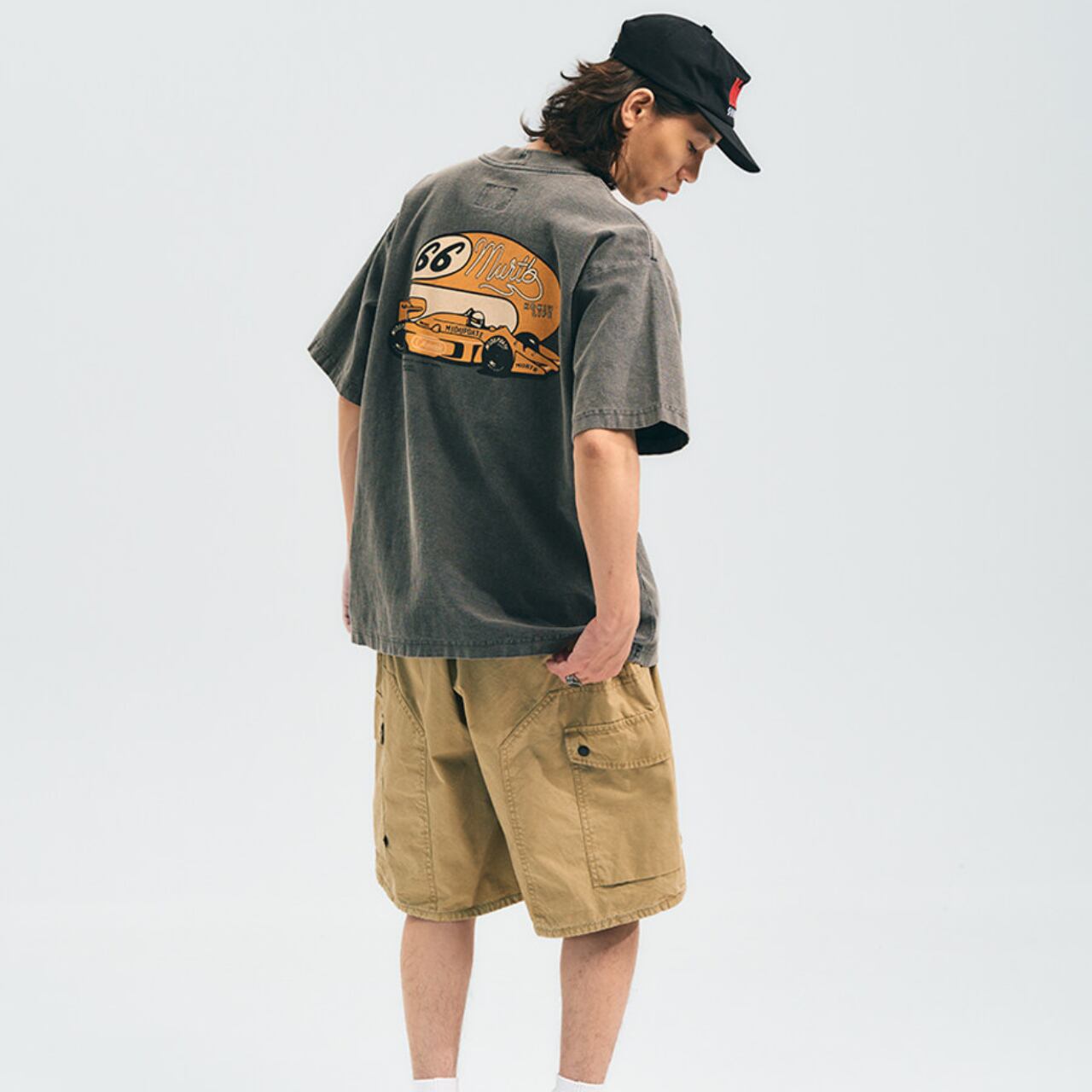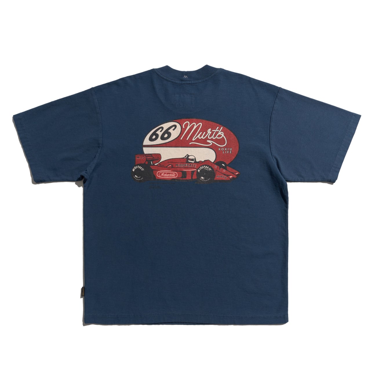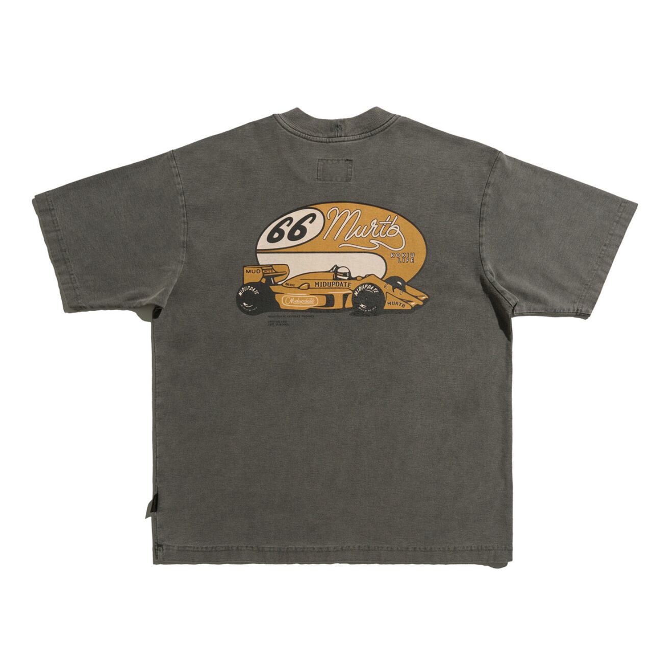 存在感のあるF1カーのバックプリントが目を惹く、ヴィンテージライクな一枚。