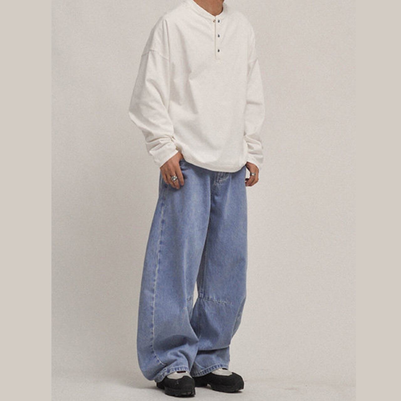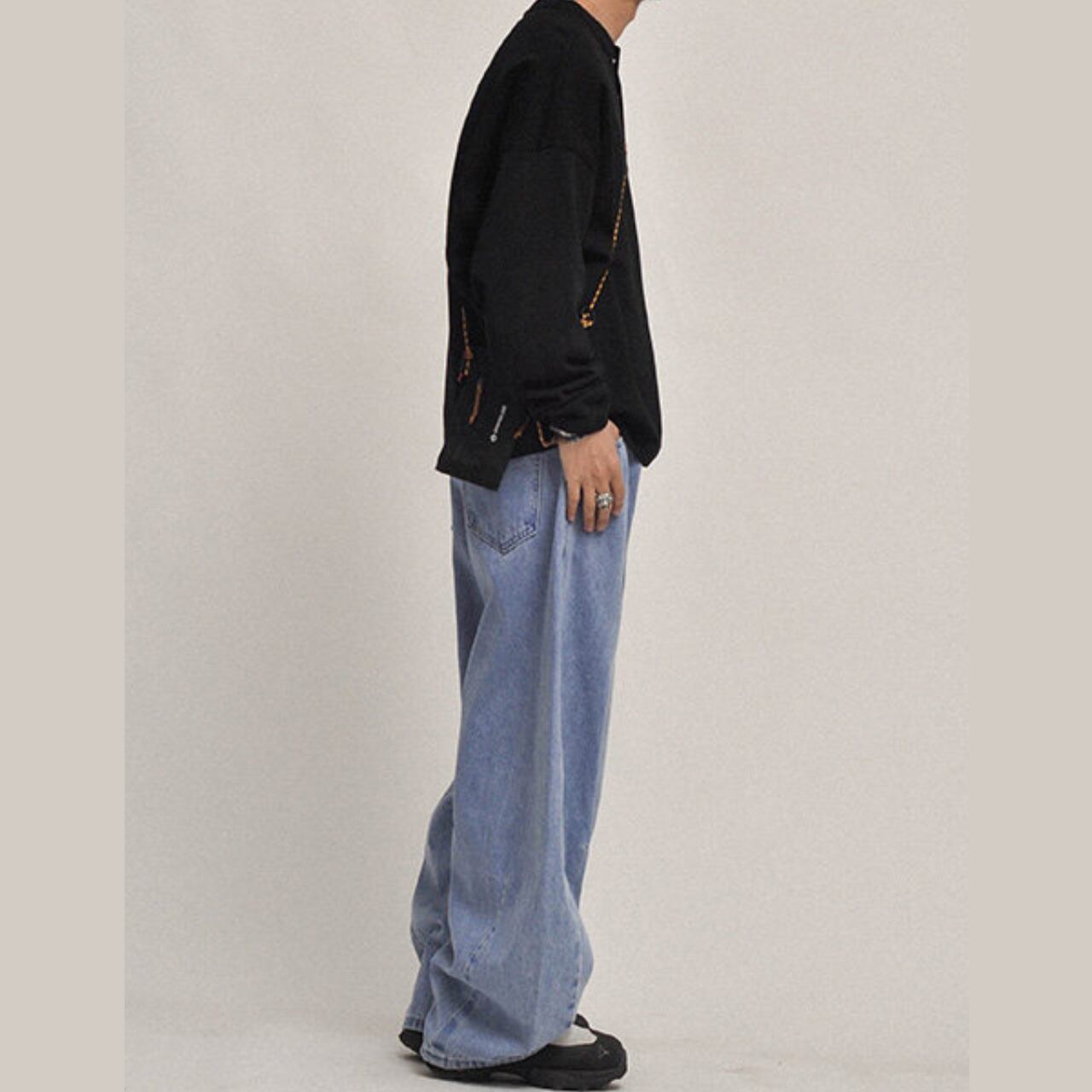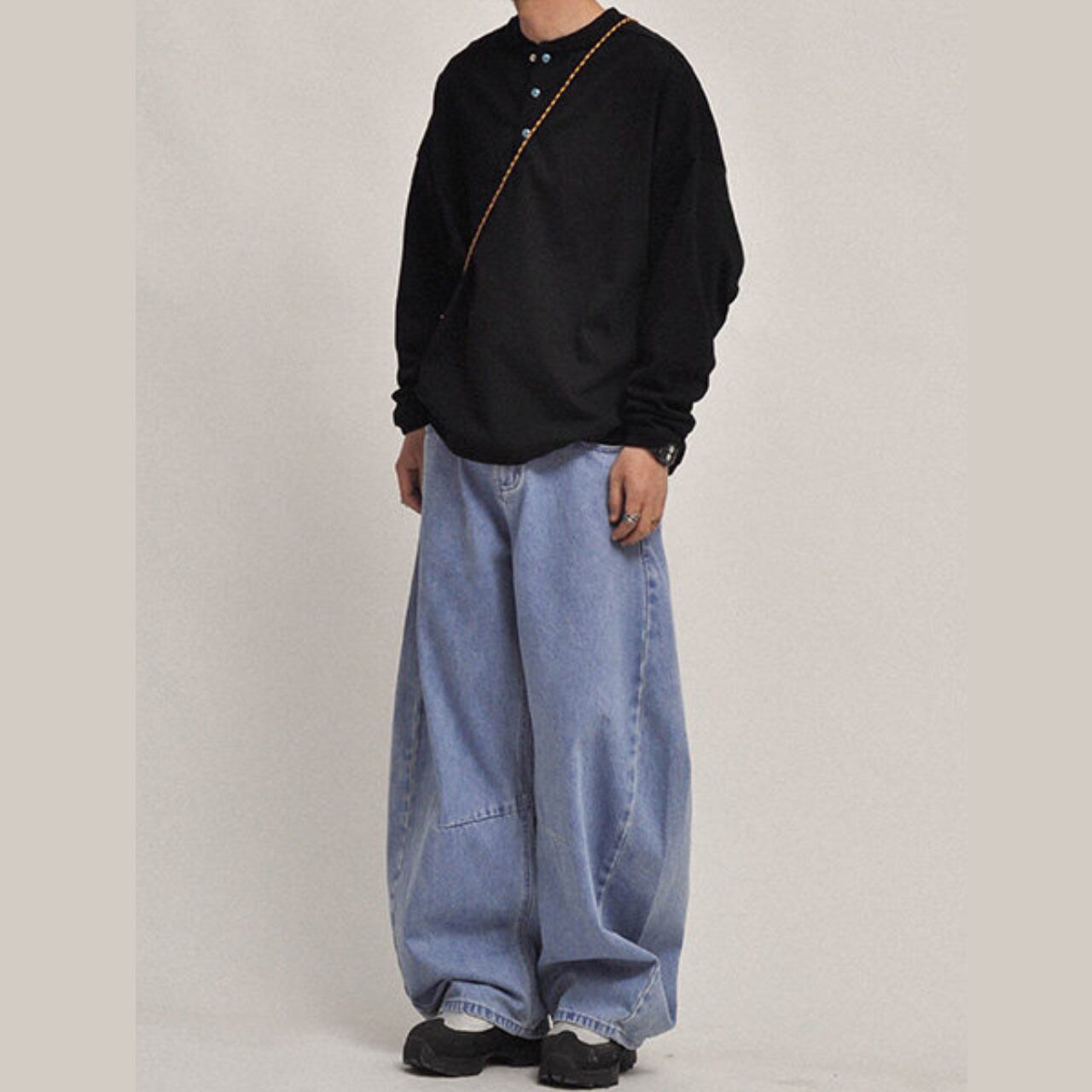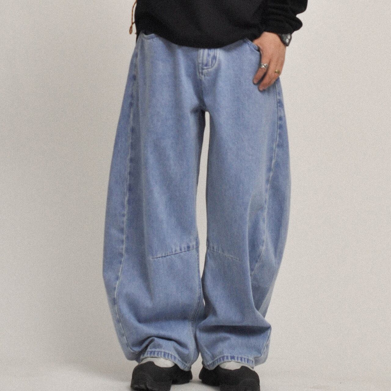ルーズで存在感のあるシルエットが魅力のヴィンテージライクなワイドデニム。程よく色落ちしたブルーがこなれた雰囲気を演出し、シンプルなトップスと合わせるだけでスタイリングが完成。ボリューム感のあるシルエットはトレンド感抜群で、ストリートから古着ミックスまで幅広く対応。足元に溜まるルーズな裾感が今っぽさを引き立てる一本です。