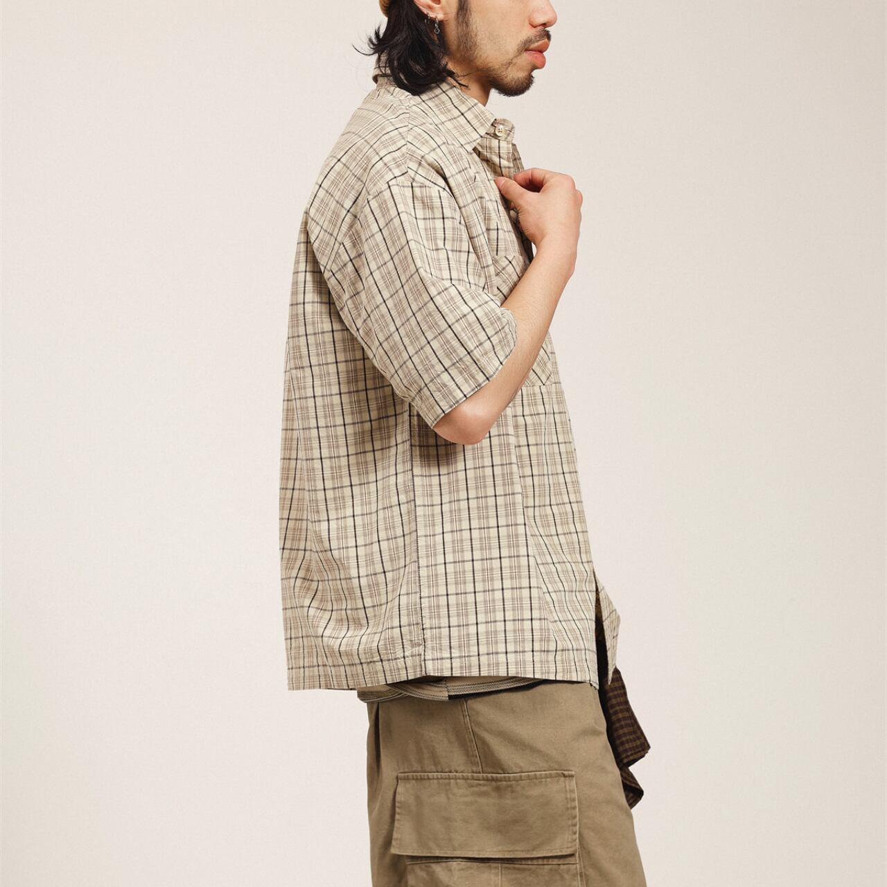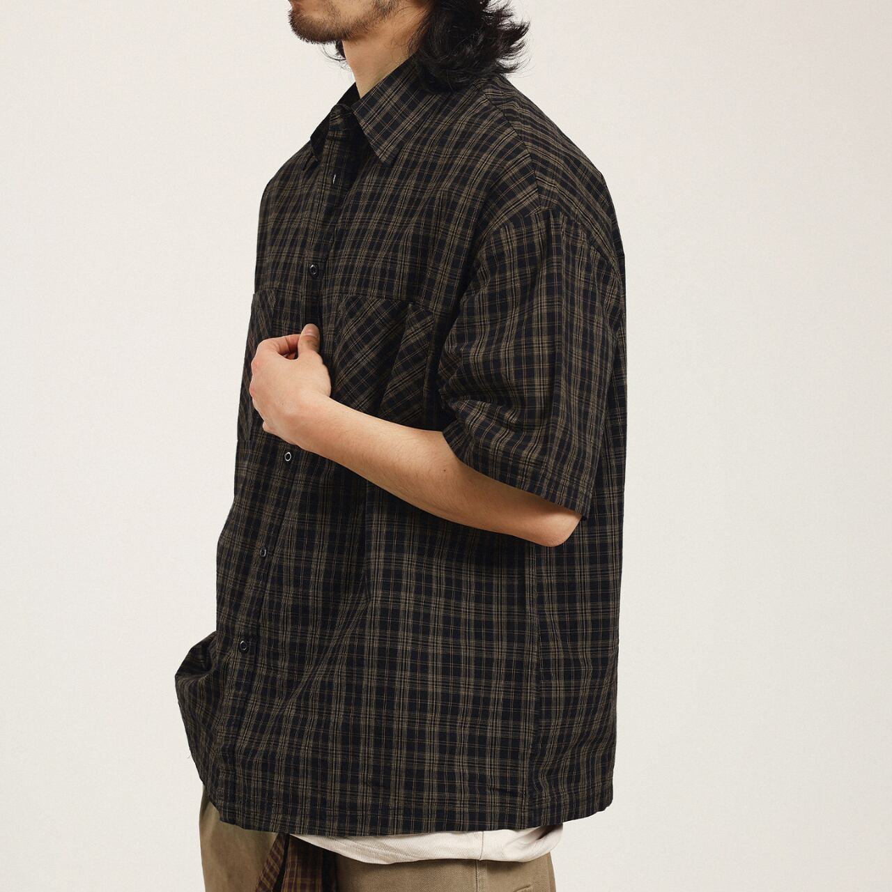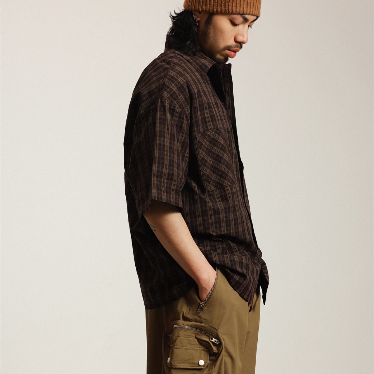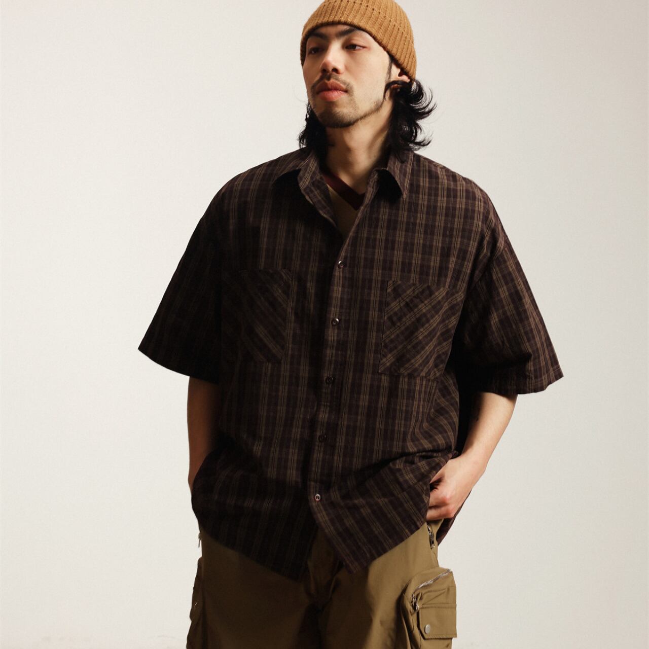 落ち着いたトーンのチェック柄が印象的な、リラックスシルエットの半袖シャツ。クラシックな雰囲気をベースに、胸ポケットの柄切り替えがさりげないアクセントになり、シンプルながらも存在感のある一着に仕上がっています。ゆったりとしたサイズ感で、Tシャツの上からラフに羽織るだけでこなれたスタイリングに。カーゴパンツやショーツと合わせた、都会的なストリートミックスにも相性抜群です。