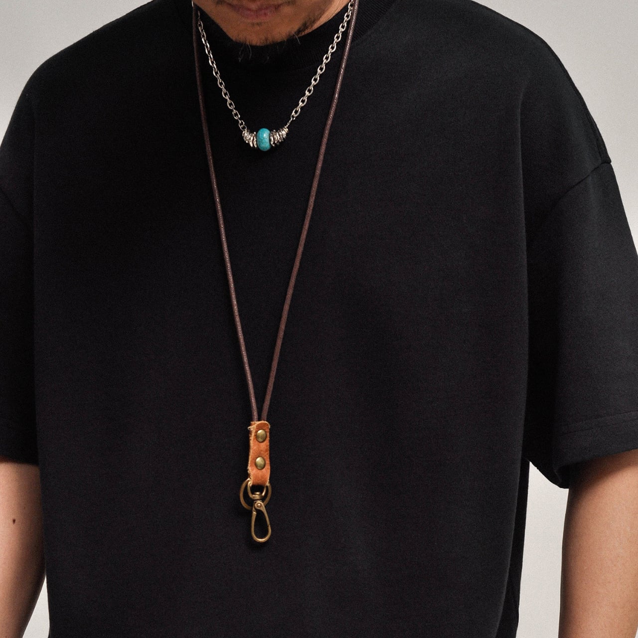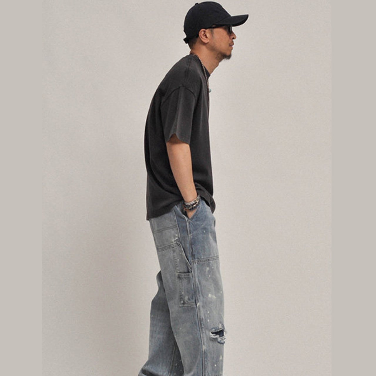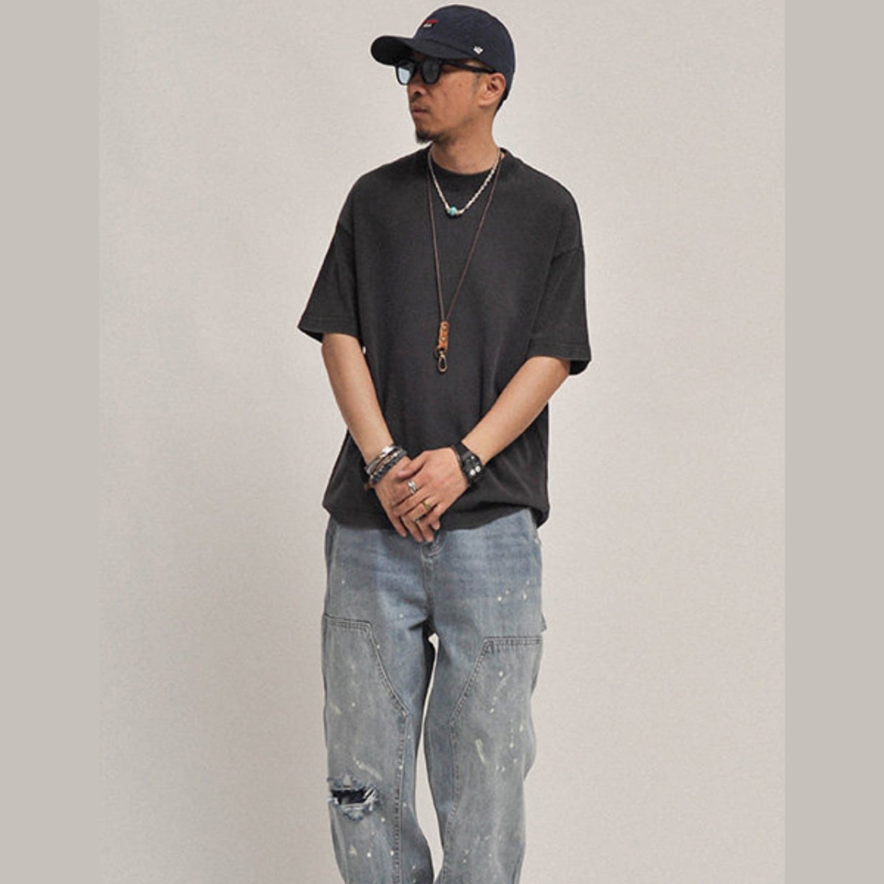 画像のようにワイドデニムと合わせることで、ラフで男らしいスタイリングに。ネックレスや小物との相性も良く、一枚で雰囲気が決まる万能アイテムです。