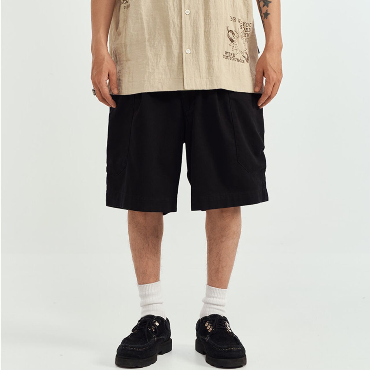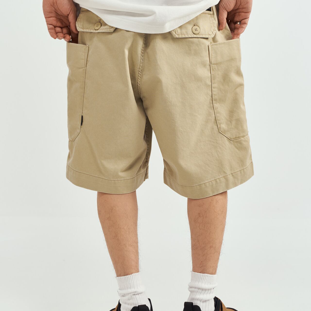 立体的なビッグポケットが印象的な、無骨さと抜け感を両立したカーゴショーツ。ハリのあるコットン素材にウォッシュ加工を施し、程よいヴィンテージ感とこなれた雰囲気を演出します。ゆったりとしたシルエットで動きやすく、Tシャツやシャツと合わせるだけでバランスの取れたスタイリングに。シンプルながらもディテールで差がつく、デイリーからアウトドアまで幅広く活躍する一本です。