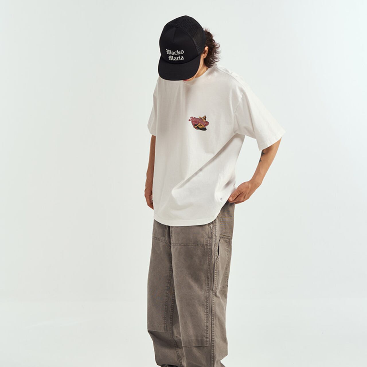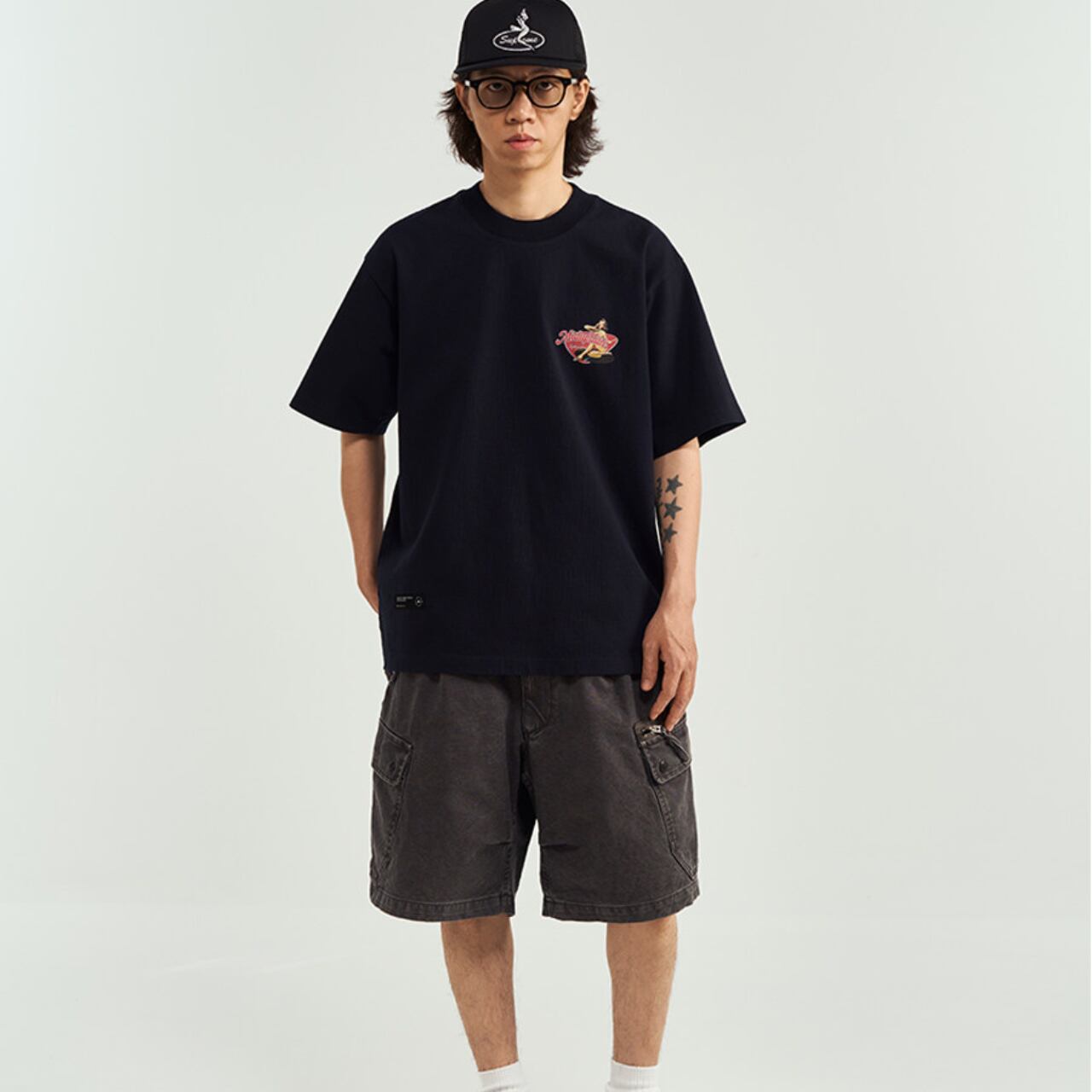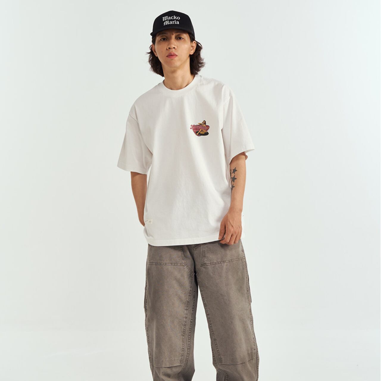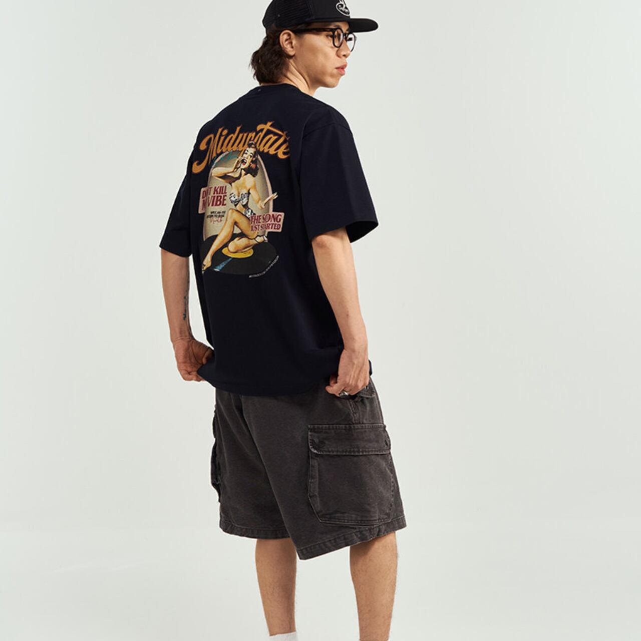 50年代アメリカンカルチャーを彷彿とさせる、存在感抜群のピンナップガールグラフィックT。フロントは控えめなワンポイント、バックには大胆なヴィンテージ風プリントを配置し、後ろ姿まで抜かりない仕上がりに。肉厚なコットン生地でシルエットはゆったり、ストリートにもクラシックにもハマる一枚。カーゴパンツやデニム、ショーツと合わせるだけで、こなれた無骨スタイルが完成します。