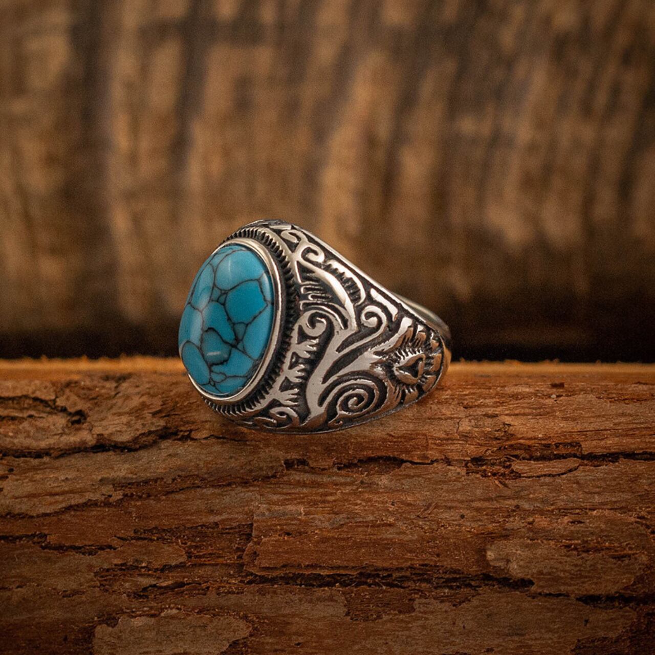 重厚なシルバーボディにターコイズを大胆に落とし込んだ、存在感のあるヴィンテージリング。