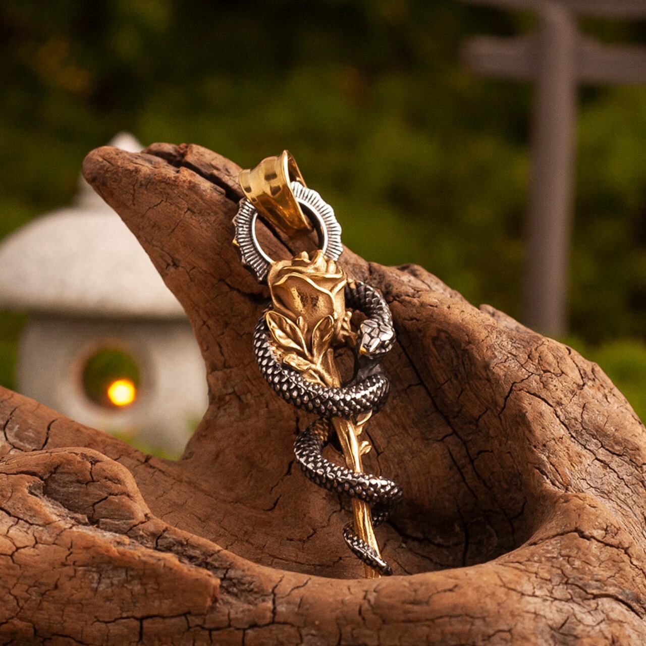 薔薇に絡みつく蛇をモチーフにした、無骨さと美しさが共存するペンダント。