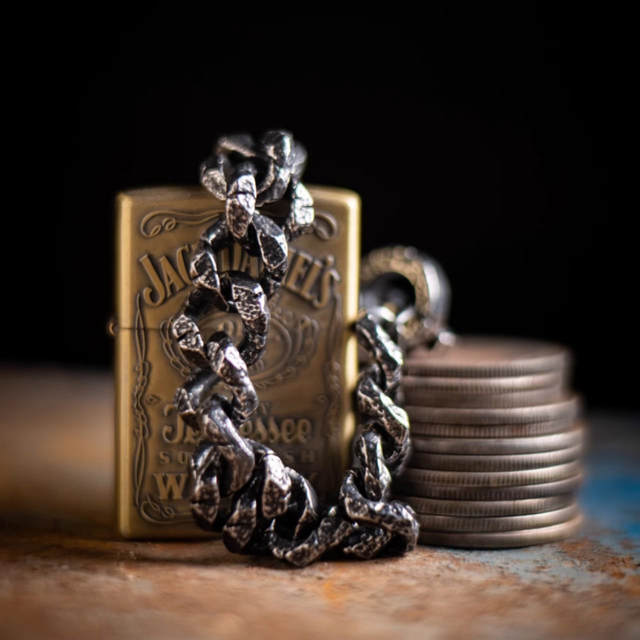 一つ一つ不均一に加工されたリンクが、ラフで荒々しい質感を演出。