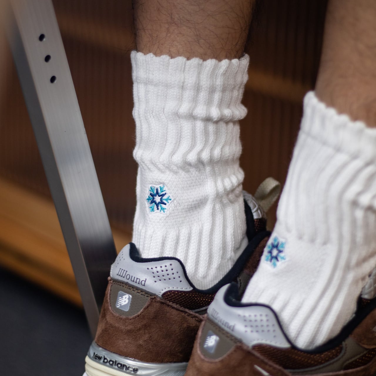 さりげないワンポイント刺繍が映える、ミニマルデザインのクルーソックス。