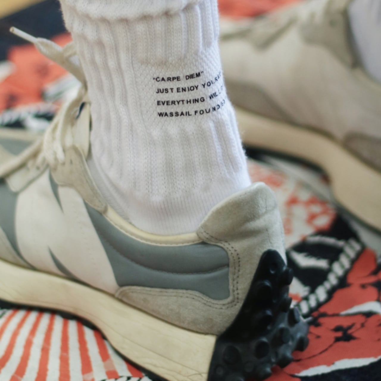 ミニマルなボディにさりげなく施されたメッセージプリントが特徴の、都会的な雰囲気を纏うリブソックス。