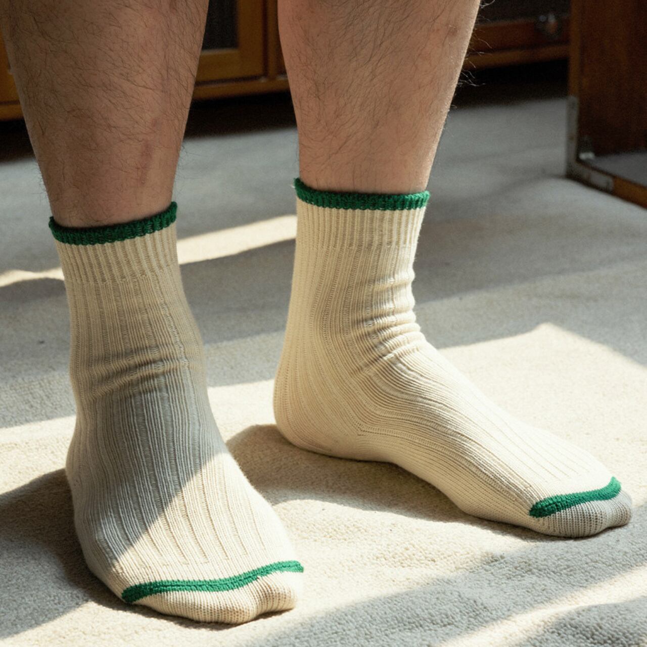 ナチュラルなボディに配色ラインを効かせた、シンプルながら存在感のあるリブソックス。