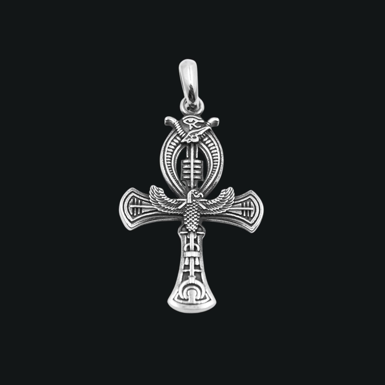 ホルスの眼とクロスモチーフを融合させた造形に、細部まで刻まれた陰影が無骨さを引き立てます。
